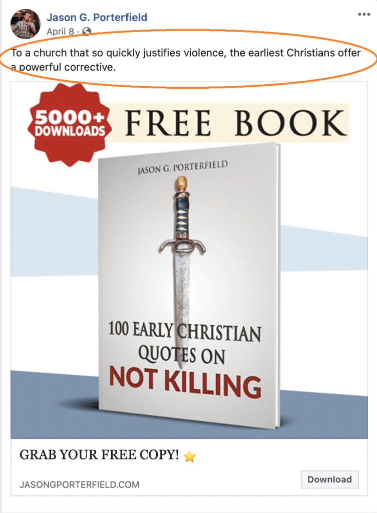 Jason: My website is JasonGPorterfield.com, and when you visit, you can get a copy of 100 Early Christian Quotes About Not Killing.